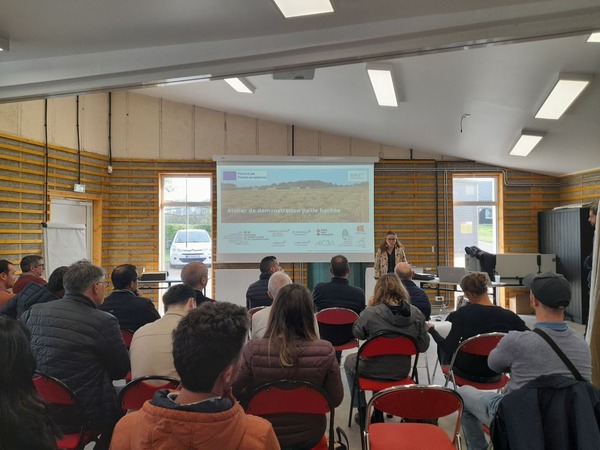 In Les Touches, participants were welcomed on visits to bio-sourced buildings by the town's first deputy mayor and the project manager from the Erdre et Gesvres Community of Communes. Together, they presented their ambitious eco-building policy, highlighting several completed and ongoing projects, and explaining the objectives, challenges and technical choices that have guided their design. In this town of 2,600 inhabitants, the former town hall has been renovated to become a health centre and a coworking space. The aim was to provide healthy, attractive spaces to encourage the installation of medical and paramedical professionals. The choice of bio-sourced materials was a major political decision, requiring the project management team to develop its skills. The head of the timber frame division at Atelier ISAC, a company with a long-standing commitment to the installation of bio-based products and trained in the installation of straw in its various forms (bales, panels, chopped straw, etc.), presented the companies involved in the project and the materials used, in particular the earth-hemp thermal corrector. The Petit-Mars Children's Centre project was also presented, which will use straw insulation panels from COPANO. The day ended with a visit to the restoration site of a farmhouse that will become a restaurant, partially renovated in hemp clay with a wooden extension clad in local wood from the commune. The Chanvre et Paysans association brought the day's presentations to a close with a presentation on the development of the hemp industry in Loire-Atlantique.