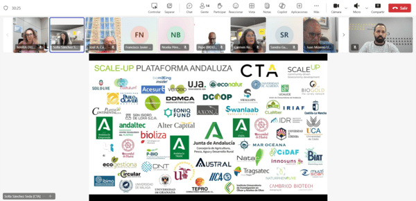 At the first meeting of the Andalusian Bioeconomy Platform, held in hybrid format at the CTA headquarters, its members were able to learn more about SCALE-UP, exchange presentations with the other entities and discuss their role in this initiative. So far, the entities that make up the platform are: